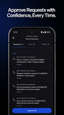 Approval queue: centralized queue to review all pending digital asset actions—transactions, policy updates, user access—with full context and bulk approval options