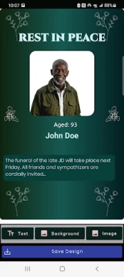 Key Features: * Intuitive Design Interface: Create beautiful funeral invitations using a simple and easy-to-use editor . * Customizable Templates: Choose from a variety of solemn and elegant background themes to set the appropriate tone for your invitation. * Flexible Editing Tools: Add and edit text and images with full control over fonts, colors, opacity and layout. Customize border widths, corner radius of added images, colors and more — to create a polished, meaningful design that reflects the personality and legacy of the departed. * Save Designs: Save your completed invitation as a image file directly to your device.