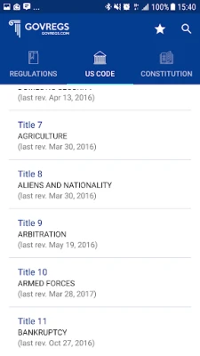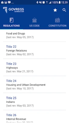 Regulations and US Code come with notes & annotations, including listing of public laws. Through this app, you will be able to access IRS and tax regulations; FDA laws; NASA's rules; Fish & Wildlife; shipping rules; import and export requirements; labor laws; First Amendment on freedom of speech, and much, much more.