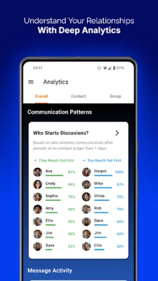- Deep analytics on your overall communication patterns, individual contact insights or group message dynamics
